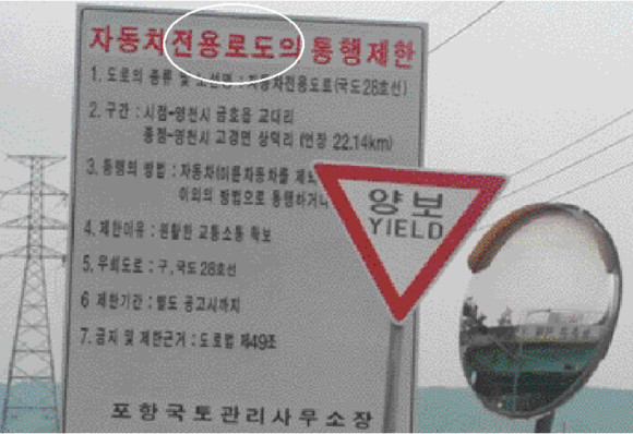 통행제한을 알리는 도로표지판의 글자가 틀려 운전자의 웃음을 자아내고 있다. 금호읍 교대리에서 고경면 상덕리까지 자동차전용도로(국도 28호선)를 알리는 표지판의 문구 가운데 전용도로를 ‘전용로도’로 표기되어 있다. 포항국토관리사무소는 “확인 후 수정하겠다.”고 답변했다.