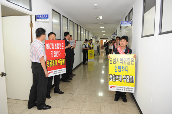 공무원노조 영천시지부(지부장 최영락)는 지난 10일, 공무원 7백여명의 서명을 받은 구조조정반대 서명서를 김태옥의장에게 전달하고 의회로비에서 침묵시위를 벌였다.