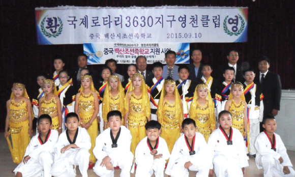 국제로타리 3630지구 영천로타리클럽(회장 이홍기)과 회원들은 지난달 10일부터 14일까지 4박 5일 일정으로 중국 길림성 백산시 백산조선족학교를 방문하여 장학금(4000달러)과 아이들에게 샤프와 볼펜 등의 학용품과 과자를 기증하고 열악한 교육 여건에 있는 조선족학교를 지원하는 봉사 사업을 실시하고 돌아왔다.
