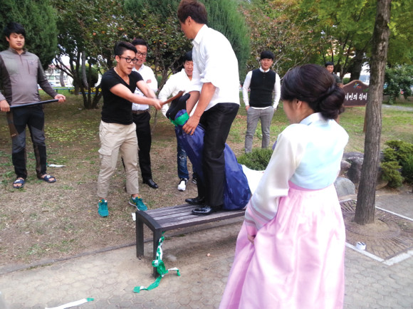 장가간 새신랑 다루기가 지난 11일 오후 시청 앞 인도 벤치에서 있었다. 이날 결혼식을 올린 신랑 신부는 우인들에 둘러싸여 ‘발바닥 때리기’ 신랑다루기 놀이를 재현했다. 신랑다루기는 90년대 들어서서는 보기 드물었으며 신혼여행 갔다 돌아오면 신부 집에서 행해진 전통이다.