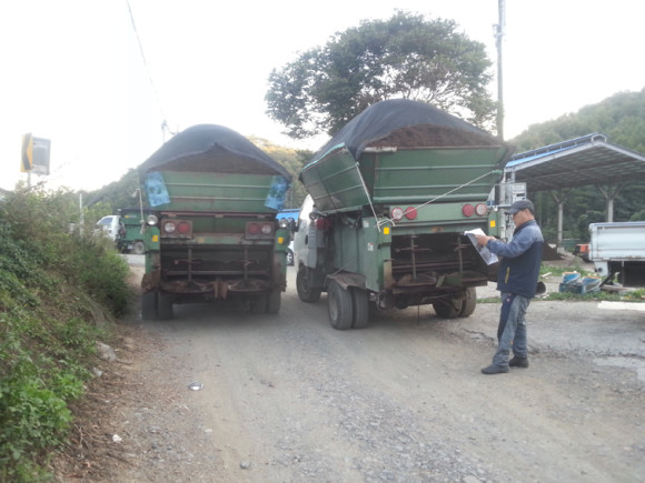 ↑↑ 삼녕영농 그린퇴비가 밭에 그대로 뿌리기 위해 차들이 줄을 서 현장으로 나간다.