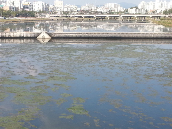 금호강에 녹조와 수초가 많이 나타나고 있다. 뿐만 아니라 물이 빠진 보 자체도 보기가 흉해 도시미관까지 헤치고 있다. 보를 가동하자 녹조 현상은 줄어들었으나 영천교를 지나는 사람들은 “강물 오염이 심하고 보 자체도 얼룩으로 더러워서 추해 보인다”고 평했다.