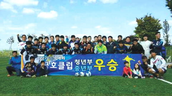 ↑↑ 시장기대회에서 3개 종목 가운데 청년부와 중년부 2개 종목을 석권한 금호클럽이 우승을 자축하고 있다.