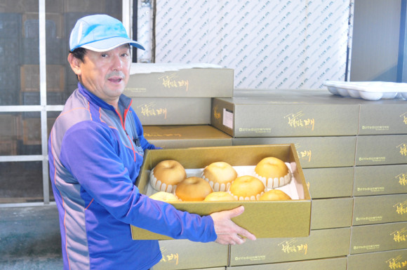 박씨는 “나무에 물을 줄 때 관주(미네랄)를 함께 주입해 주면 경도(육질)와 당도가 좋아진다.”고 귀뜸했다. 또, 배 하나의 무게는 800g~1kg까지 나가고 포장은 7.5kg과 15kg 두가지를 이용하고 있는데 앞으로는 10kg무게로 맞춰야 할 것 같다고 덧붙였다.