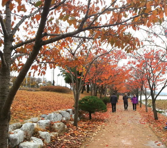 우로지가 가을의 대명사로 자리 잡았다. 단풍으로 변한 우로지 벚나무 가로수들이 시민들을 반기며 아늑한 휴식공간을 제공하고 인기도 만점이다. 사진은 지난 9일 오후 한 부부가 우로지를 걸으며 운동을 하고 있는 모습.