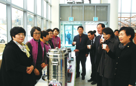 생활체육대회 개회식이 열리는 생활체육관에서 (사)영천시자원봉사센터 소속의 미심회(회장 옥나경) 회원들이 차와 음료를 제공하며 봉사활동을 하고 있는 가운데 기관단체장들이 고마움을 표시하고 있다.