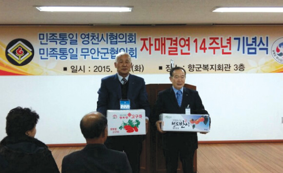 민족통일영천시협의회와 무안군 협의회는 지난 1일 전남 무안군 향군복지회관에서 두 단체 자매결연 14주년 기념식을 가지고 그간의 우의를 다졌다. 두 단체는 먼저 자매결연 협정서를 낭독하고 회원 소개, 공로패 전달, 환영사, 기념품 교환, 통일 노래 순으로 행사를 진행했다.