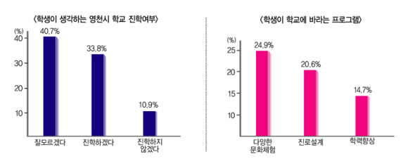 지역학생 1704명을 대상으로 교육발전계획 수립 학술연구과정 설문조사(학생용)를 분석한 결과 지역학생들은 교사에 대한 신뢰도는 있지만 교육과정과 진학에 대한 불신이 많은 편이다. 또 진로를 본인 스스로 결정한다(62.5%)는 것도 문제점으로 대두되고 있다. 영천시 관내 진학여부에 대하여 △잘 모르겠다 40.7%, △진학하겠다 33.8%, 진학하지 않겠다 10.9%순이다.