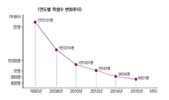 지금으로부터 23년 전인 1992년으로 거슬러 올라가 보자. 당시 영천의 학교수는 초등학교 43개교(분교 5개 포함), 중학교 16개교, 고등학교 9개교이다. 중·고등학교는 지금과 비슷하지만 초등학교는 엄청난 차이를 보이고 있다. 학생수를 살펴보면 초등학생 1만929명, 중학교 5878명, 고등학생 6324명으로 2015년 현재 초등학생 3563명, 중학생 2124명, 고등학생 2943명과 비교가 되지 않는다.