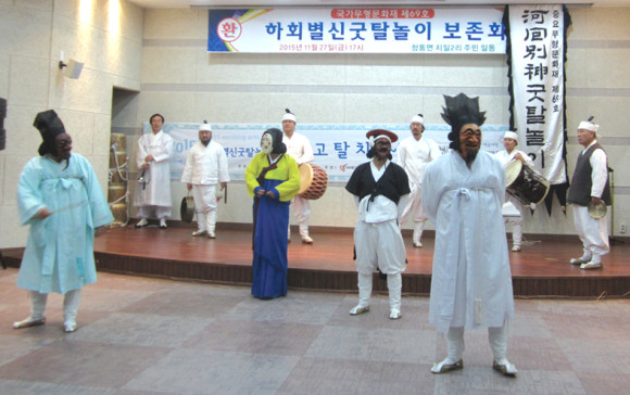 800년을 이어온 국가무형문화재 제69호 하회별신굿 탈놀이 보존회(회장 임형규)가 지난 7일 청통면민복지관에서 100여명이 관람한 가운데 공연을 했다.