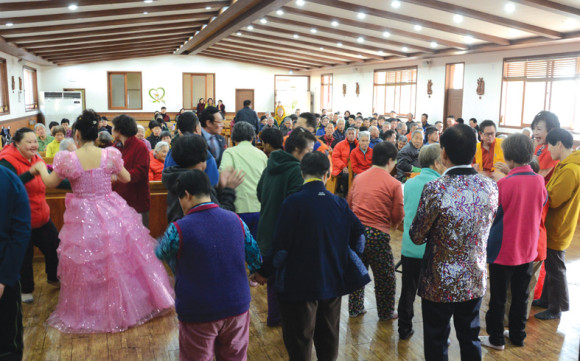 ↑↑ 영천엽도회 회원과 무지개예술봉사단 단원들이 나자렛집에서 위문공연을 펼치고 있다.