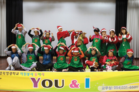 ‘YOU & I’봉사단은 2009년부터 시작된 전국최초 지적장애학생 봉사 동아리로서 장애로 인해 늘 봉사를 받기만 한다는 선입관을 개선하고자 받는 봉사가 아닌 주는 봉사라는 목표를 가지고 지역사회 소외계층을 찾아 매월 2회 찾아가는 봉사활동을 펼치고 있다. 이날 봉사단원들과 요양원 환우들은 함께 크리스마스 케이크 만들기, 이색적인 트리 꾸미기, 크리스마스카드 만들기, 매개치료견과 교감하기 등의 다양한 활동을 하며 즐거운 시간을 가졌다.