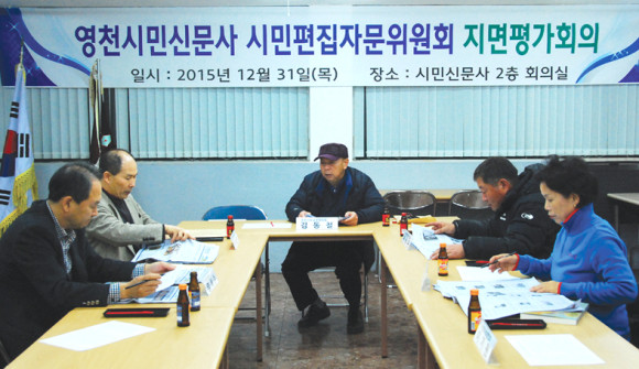 영천시민신문 시민편집자문위원회는 2015년 마지막 날인 구랍 31일 시민신문 2층 회의실에서 2015년도 제4차 지면평가회의를 개최했다. 위원들은 884호~895호까지 발행한 신문의 편집 및 내용에 대하여 토론의 시간을 가졌다. 이날 회의에는 김동철(교육계), 이재건(장애인 단체), 이춘자(새마을지회), 전성윤(한농연), 양석수(노동계) 위원 등 5명이 참석하여 회의를 진행했으며 내용을 요약 보도한다.