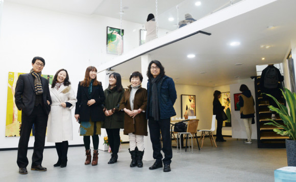 | | | ↑↑ 복층구조인 갤러리 ‘큐브’에 관람객들이 이동하며 작품을 감상하고 있는 가운데 남편과 함께 선 황정아 작가(왼쪽 두번째)와 조은정 대표, 이지홍 실장, 오영희·박세호 작가가 함께 황 작가의 전시를 축하하며 기념사진을 찍고 있다 | | ⓒ 영천시민뉴스 | | 도심속의 작은 갤러리 ‘큐브’는 영천의 젖줄 금호강을 따라 조성된 강변공원과 맞닿아 있다. 강변공원의 분수대를 출발하여 영동교 다리밑을 지나 망정동 방향으로 강변을 산책하려는 시민이라면 옛 통나무집 식당이 있던 골목으로 열 걸음 정도만 걸어가면 만날 수 있는 곳이 갤러리 ‘큐브’이다. 한마디로 강변을 끼고 있는, 시내에서 아주 가까운 이웃 같은 갤러리이다.
