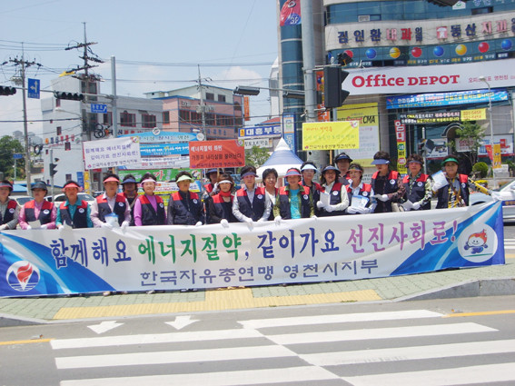 한국자유총연맹 영천시지부(지부장 조영제) 회원 31명은 지난 9일 오전 시청오거리에서 유가인상 등으로 에너지난이 극심한 이때 '절약만이 난국을 극복할 수 있다'는 피켓과 홍보전단을 시민들에 나누며, 에너지절약 동참을 호소하는 캠페인을 가졌다.