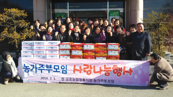 금호농협(조합장 정윤식)청통지점 농가주부모임(회장 이태교)은 지난 1일 설맞이 행사로 관내 영농회를 통해 마을마다 경로당에 떡국과 생필품(200만원 상당)을 전달했다. 25명으로 구성된 금호농협청통지점 농가주부 회원들은 매년 생강 멸치 청각을 판매한 수익금으로 사랑나눔 행사를 하였다.