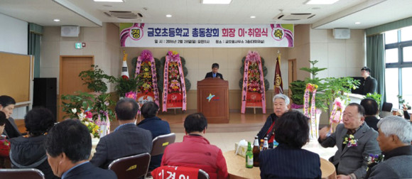 금호초등총동창회 회장단 이 취임식이 지난 28일 오전 금호읍 사무소 3층 대회의실에서 김옥경 여사, 박순덕 여사, 권호락 시의장, 한혜련 김수용 도의원, 이창식 전 시의원, 전영준 전 총동창회장 및 전 현직 총동창회장, 각 기관단체장 등 100여 명이 참석한 가운데 열렸다.