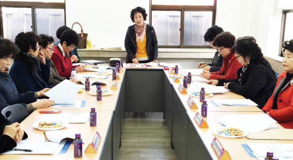 ↑↑ 이춘자 회장(가운데) 이 여성단체협의회총회를 주관하고 있다.