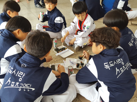 신녕 아리랑태무 시범단(독도사랑스포츠공연단)이 지난 26일 영천체육관에서 열린 국제로타리 3630지구 2015-16 지구대회에 참가하고 축하 공연을 위해 기다리고 있던 중 간식을 먹으며 대화로 ‘팀워크’를 다지고 있다.