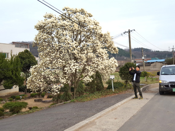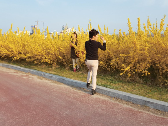 만개한 봄꽃에 시민들 표정도 만개 선화여고 정문에 벚꽃과 개나리가 만개했다. 지난 1일 저녁시간 학생들이 교문을 나서면서 친구들과 아름다운 꽃을 배경으로 추억을 만들고 있다(맨 위). 북안면 고지리 한 농가 입구에 크고 작은 두 그루의 목련나무가 나란히 꽃을 피워 지나는 이들의 발길을 붙잡고 있다(중앙). 과전동 조밭골 아래 둔치에 개나리가 만개해 시민들이 사진을 찍느라 정신이 없을 정도였다(아래).