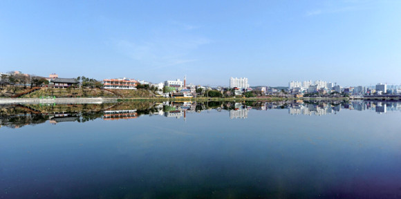 영천 둔치의 아름다움 영천 둔치가 이렇게 아름다울 수가 없다. 한강 둔치처럼 봄 향기가 물씬 풍기는 금호강 둔치에는 봄꽃들이 곳곳에 아름답게 피어 있으며, 강 건너 보이는 빌딩은 푸른 하늘과 푸른 물 사이에 펼쳐진 병풍처럼 보인다. 둔치는 영천의 국보다.