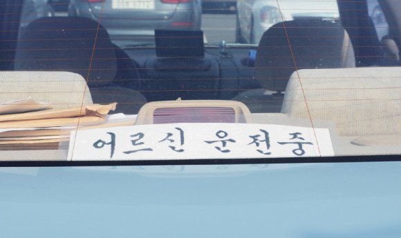 자동차 뒷창에 놓인 '어르신 운전중' 안내문 ‘초보운전’ ‘아이가 타고 있어요’ 등 뒷차량에 양해를 구하는 차량스티커에 ‘어르신 운전중’이라는 문구가 등장했다. 최근 고령자 운전의 위험성이 대두되고 있는 시점에서 ‘어르신 운전중’이라는 차량스티커 문구가 지나는 이들의 눈길을 끈다.