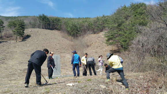 한식을 맞아 면사무소 직원들은 매년 삭막해 지고 있는 분묘관리를 위해 나무 그루터기 제거 및 부직포 피복 작업을 통해 무연분묘 제단 주변을 정비하는 등 봉사활동을 매년 정기적으로 실시하고 있다.