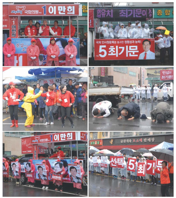 영천장날인 지난 7일 기호 1번 이만희 후보(사진 좌측)와 기호 5번 최기문 후보(사진 우측)가 비가 오는 궂은 날씨에도 불구하고 자신을 지지해 달라며 호소하고 있다.
