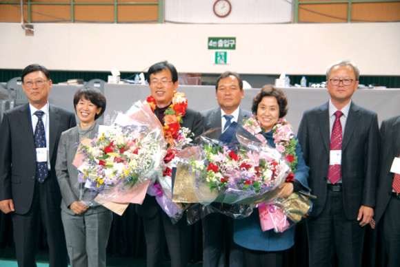 4·13총선에서 이만희 후보가 마지막에 웃었다. 사진은 지난 14일 새벽 2시경 개표가 종료되고 당선증 교부식을 가진 뒤 이만희 당선자를 비롯한 선관위관계자들이 기념촬영을 하면서 환하게 웃고 있다. 좌로부터 송무근 영천선관위 부위원장, 이영숙 위원장, 이만희 당선자, 권순호 위원, 황선미 당선자 부인이다.
