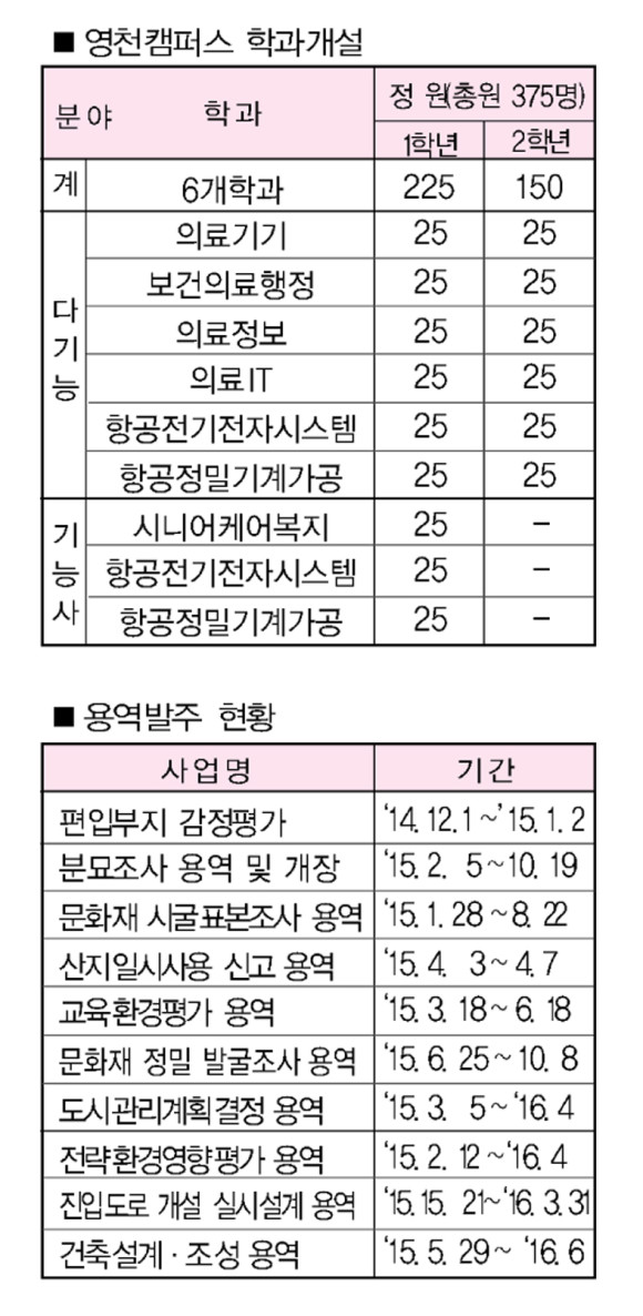 | | | ⓒ 영천시민뉴스 | | 이처럼 영천캠퍼스 유치와 개교를 위해 수많은 사람들이 노력을 기울이고 있는 가운데 성공적인 영천캠퍼스가 되기 위해서는 다양한 방안을 모색하야만 한다. 가장 먼저 영천캠퍼스에서 운영되는 학과와 학생수 결정이다. 최초 2~3개 학과만 만든다고 했지만 김영석 시장과 정희수 국회의원을 비롯한 영천시와 교육관계자들의 노력으로 현재의 6개 학과로 출발하게 된 것이다. 물론 학생수도 다른 캠퍼스와 비교했을 때 조금 뒤처지지만 출발단계를 고려하면 만족할 단계이다. 다만 2학년이 100명 가까이 줄어드는 것을 보완해야만 한다.