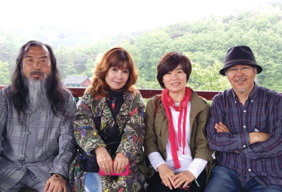 ↑↑ 좌측부터 전민욱 해설사, 여행팀의 희승연씨, 안영미씨, 송일봉작가가 임고서원 조옹대의 무괴정에서 포즈를 잡고 있다.