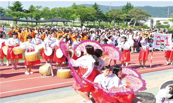 지난 20일 영천성남여중고교가 봄철 교내체육대회를 실시했다. 이날 학생들의 체육대회 입장식 퍼포먼스가 화려하면서도 다양하고 톡톡튀는 아이디어로 선보여 눈길을 끌었다. 각반 학생들이 준비한 입장식은 마치 가장무도회를 보는듯했고 교사와 내빈, 참석한 학부모들에게 큰 볼거리와 즐거움을 동시에 선사했다.