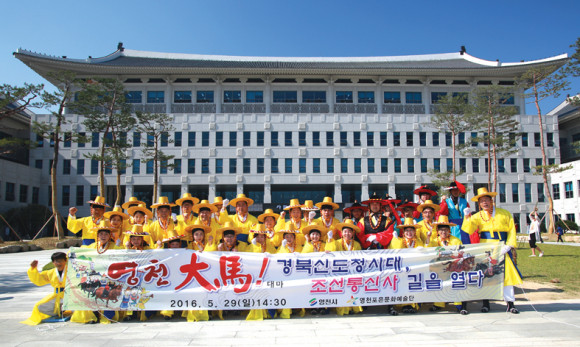 영천시 포은문화예술단(단장 장영준)이 신도청시대를 맞아 지난 29일 경북도청 광장에서 문화공연을 펼쳤다. 신녕풍물단의 식전공연에 이어 영천시 공무원 취타대홍보단을 선두로 경북도립대학교 학생 100여명이 참여한 조선통신사 행렬 재연, 아리랑태무시범단, 청년조선통신사 단원들의 영천대마퍼포먼스가 열렸다.