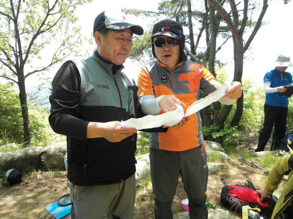 | | | ↑↑ 박근득(좌)박상준 대원이 지도를 보며 길을 찾고 있다. | | ⓒ 영천시민뉴스 | | 지도를 보고 방향을 표시하고 유운식 대원이 앞장서 나갔다.(이지점에서 영지사 가는길 푯말 설치 필요함) 모두들 따라 갔다. 조금 내려오니 초파일 목탁소리가 들렸다. 소리방향으로 계속 내려가면서 가시밭길, 땅바닥이 보이지 않는 숲길, 가파른 언덕 등을 지나 내려갔는데, 대원들은 서로를 위하며 다소 험난한 길을 개척하고 탐사하면서 나갔다. 이것이 바로 탐사대의 할 일이다고 생각하는 대원들도 있었다.