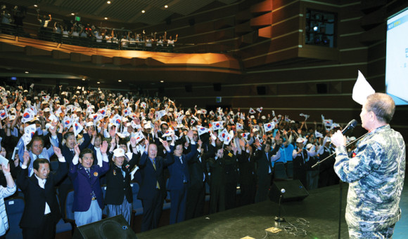 ↑↑ 6·25전쟁 제66주년 행사에 참석자들이 만세삼창을 외치고 있다.