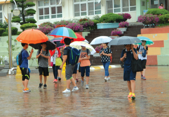 전국적으로 장마가 시작되었지만 영천에는 그다지 많은 양의 비는 내리지 않아 큰 피해발생은 아직까지 없는 것으로 나타났다. 지난 1일부터 시작된 비는 1일 25.5㎜, 2일 19㎜, 3일 24.5㎜, 4일 11.5㎜를 기록했다. 사진은 장마가 시작되면서 지역의 초등학생들이 우산을 쓰고 하교하는 모습이다.