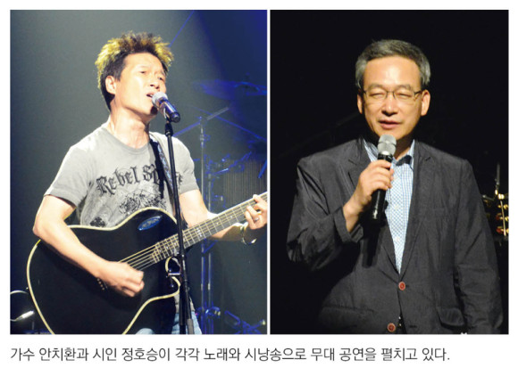 오후 3시와 7시 두 차례에 걸쳐 진행된 공연 ‘안치환, 정호승을 노래하다’는 가수 안치환과 그의 밴드 ‘자유’가 ‘내가 만일’, ‘사람이 꽃 보다 아름다워’ ‘광야에서’ 등의 히트곡과 정호승 시인의 시에 곡을 붙인 ‘인생은 나에게 술 한잔 사주지 않았다’, ‘풍경 달다’ 등을 불렀으며 정호승 시인의 시낭송과 작가의 이야기가 어우러졌다.