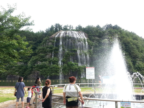연일 폭염이 기승을 부리고 있는 가운데 지난 17일 오후 도내 피서지로 각광을 받아온 임고강변공원 폭포수가 가동됐다. 산 위에서 내려오는 폭포수 가동으로 인해 지역과 먼 곳에서 찾아온 피서객들이 볼거리 제공에 만족하며 즐거워하고 있다.