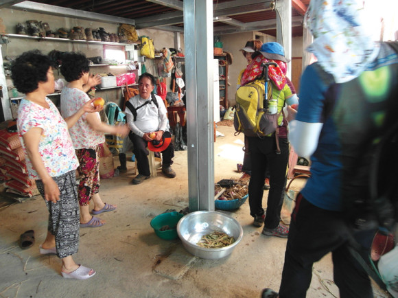 마을에 들어오니 주민 2명이 대원들을 반겼다. 이중 조명재 대원(자양면장)은 과거 대창면장 역임하면서 친분이 있는 사람들이라 더 많은 반가움을 나타냈다. 시원한 물과 과일로 갈증을 달랬는데, 앞에 간 대원들은 시원함을 맛보지 못했다. 뒤에 처진 대원 5~6명만 시원함을 맛보았다. 그리고는 먼저 도착한 버스에 올라 출발지로 돌아왔다.