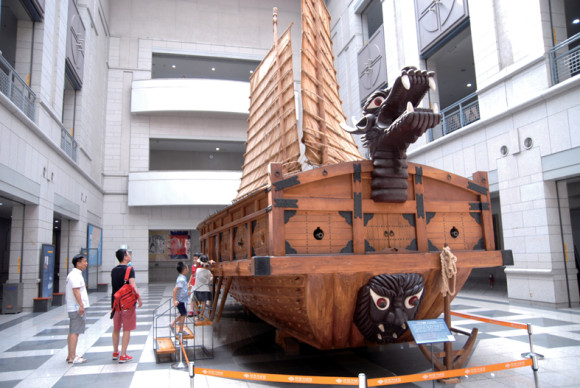 | | | ↑↑ 중국 관광객들이 거북선 안을 보고 있다. | | ⓒ 영천시민뉴스 | | 전쟁기념관 1층 특별홀에는 임진왜란 당시 이순신 장군이 사용했던 거북선이 전시되어 있으며 사천·한산도해전 등의 여러 해전에서 왜선을 격파함으로써 수군이 해상을 장악하는데 결정적 공헌을 했다고 설명되어 있다.
