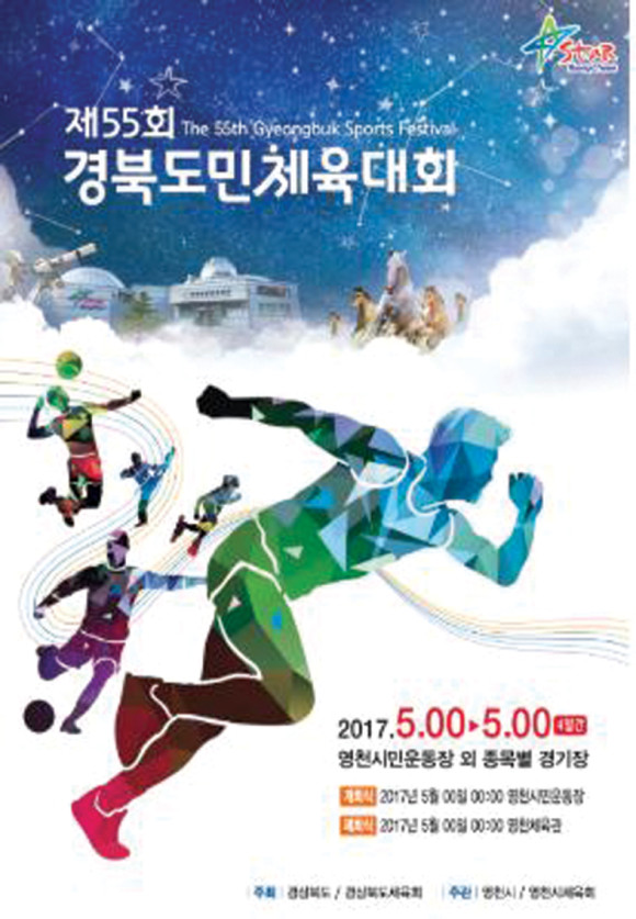 내년 영천에서 개최되는 도민체전 상징물이 선정됐다. 당선작으로 대회마크는 ‘별빛도시 영천에서 경북이 하나 되다’ 주제의 작품, 마스코트는 ‘스타영천과 프라이드 경북의 이미지를 형상화’한 작품, 구호는 ‘별빛가득 영천의 꿈, 희망가득 경북의 힘’ 등의 작품이 각각 선정되었다. 사진 위로부터 포스터, 마스코트, 대회마크 당선작.