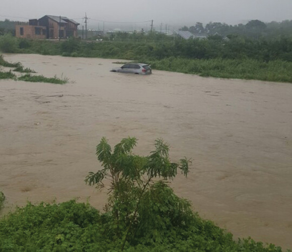 이틀 동안 많은 비가 내렸다. 지난 3일 아침 7시경 단포교 위 해피포유 앞 금호강에 RV차량이 떠내려가고 있다. 이 차가 강물에 어떻게 들어갔는지 이유는 밝혀지지 않고 있다.