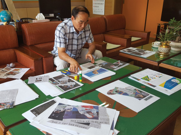 윤동주 자천초등학교장이 지난달 말 학생들 개학(29일)전 신문스크랩을 열심히 만들고 있다. 스크랩 내용은 모두 ‘리우 올림픽’ 선수들 관련 사진과 내용이다. 윤 교장은 “학생들은 내용을 봐도 잘 모른다. 그러나 그림과 함께 보면 학생들도 목표(꿈)를 세울 수 있다.”면서 “목표를 세우고 나가는 학생들에 조금이라도 도움을 주자는 의미다.”고 설명했다.