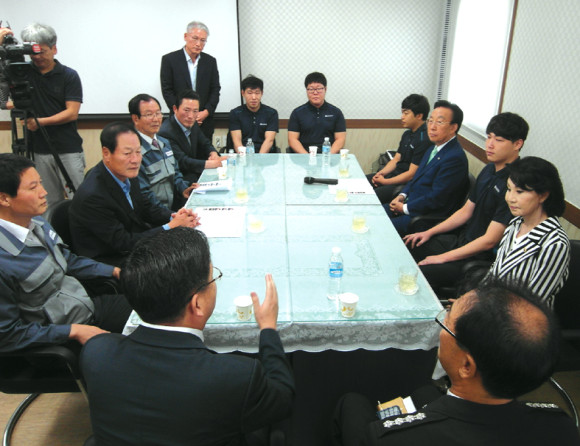 김관용 도지사가 지난 8일 오전 북안면 기저귀 원단 생산업체인 한스인테크를 방문하고 고졸 취업생들과 청년 고용에 대한 대화를 나누고 취업생들을 격려했다. 취업생들은 영천고와 영천공업고 영천상업고 졸업생들 등이며 한스인테크는 청년고용 선도기업으로 선정됐다.