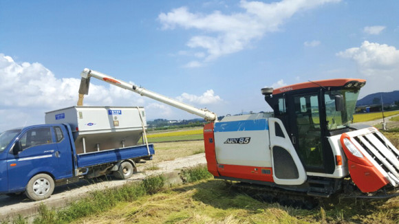 지난 23일 오전 동부동 일명 ‘새미들’엔 벼 수확 작업하는 콤바인이 벼를 베고 바로 나락을 만들어 곡물이송기에 담고 있다. 곡물이송기에 담긴 나락은 바로 곡물건조기에 들어가 건조 후 맛있는 밥이 되기 위해 도정을 기다린다.