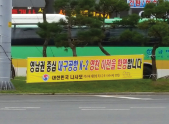 대구공항 K-2 군 공항 이전 환영 현수막이 서문육거리 중앙 화단에 등장했다. 반대 현수막 일색이었던 지역에 환영 현수막이 등장하자 지나는 시민들도 공감. 시민들은 “이제까지 반대 현수막만 봤는데, 어느 단체인지 몰라도 공항 영천 이전 환영 현수막을 보니 환영하는 단체도 있다는 것을 알 수 있는데, 환영하는 단체들의 목소리도 표현했으면 한다”고 한마디씩.