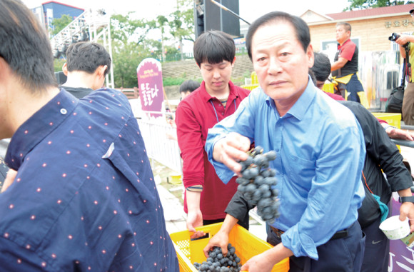 | | | ↑↑ 김영석 시장이 영천포도를 선보이고 있다. | | ⓒ 영천시민뉴스 | | 9월 30일부터 4일간 열린 2016 영천한약과일축제에는 역대 가장 많은 인파가 몰려 성황을 이루었다. 대회첫날 우중에서 진행된 개막식에서는 무대 앞에 설치된 초대형천막 덕택에 관람객들이 비를 맞지 않고 개막행사와 포도아가씨 선발대회를 지켜봤다.