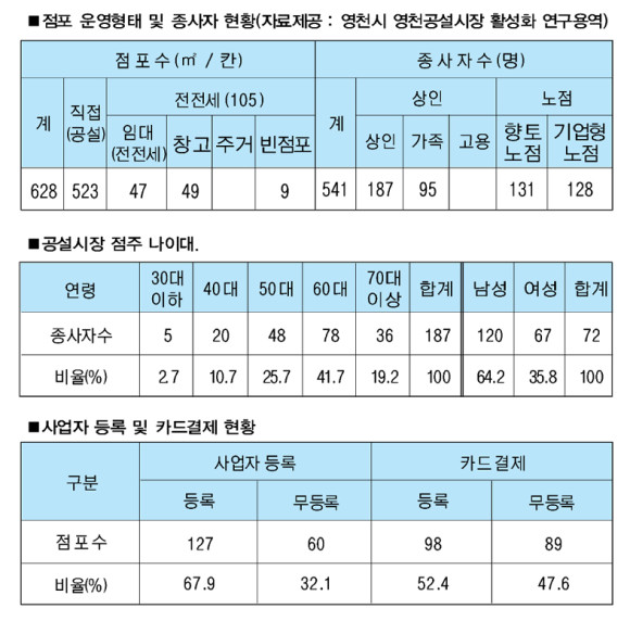 영천공설시장 활성화 연구용역에 따르면 공설시장 점포현황은 1지구 174칸, 2지구 170칸, 3지구 144칸, 4지구 140칸 등 총 628칸이다. 이중 항상 문제로 제기되어 오던 전전세가 47칸, 창고 49칸, 빈점포 9칸이다.