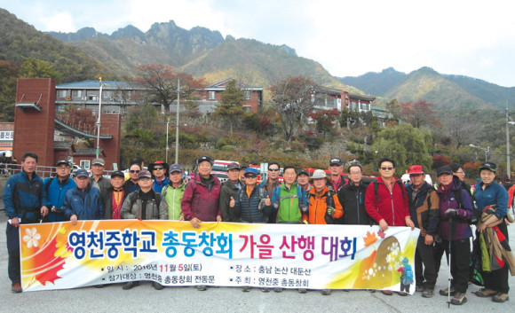 영천중학교 총동창회(회장 정연화) 산악부 산행대회가 지난 5일 오전 영천시청을 출발해 충남 금산군과 전북 완주군에 경계에 위치한 대둔산에서 있었다.
