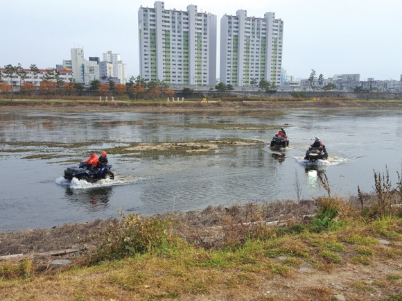 지난 13일 오후 사륜오토바이들이 물 빠진 금호강에서 즐거운 시간을 보내고 있다. 사륜오토바이에는 부자와 부녀들로 보이는 가족들이 타고 특유의 강과 산으로 다니며 재미를 만끽하고 있다.